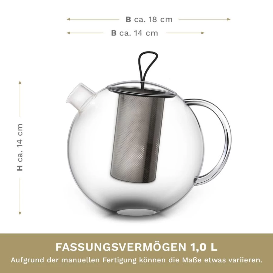 Inhalt 1 GlasTeekanne 1,0l mit Edelstahlfilter und Glasdeckel mit Silikonschlaufe.
