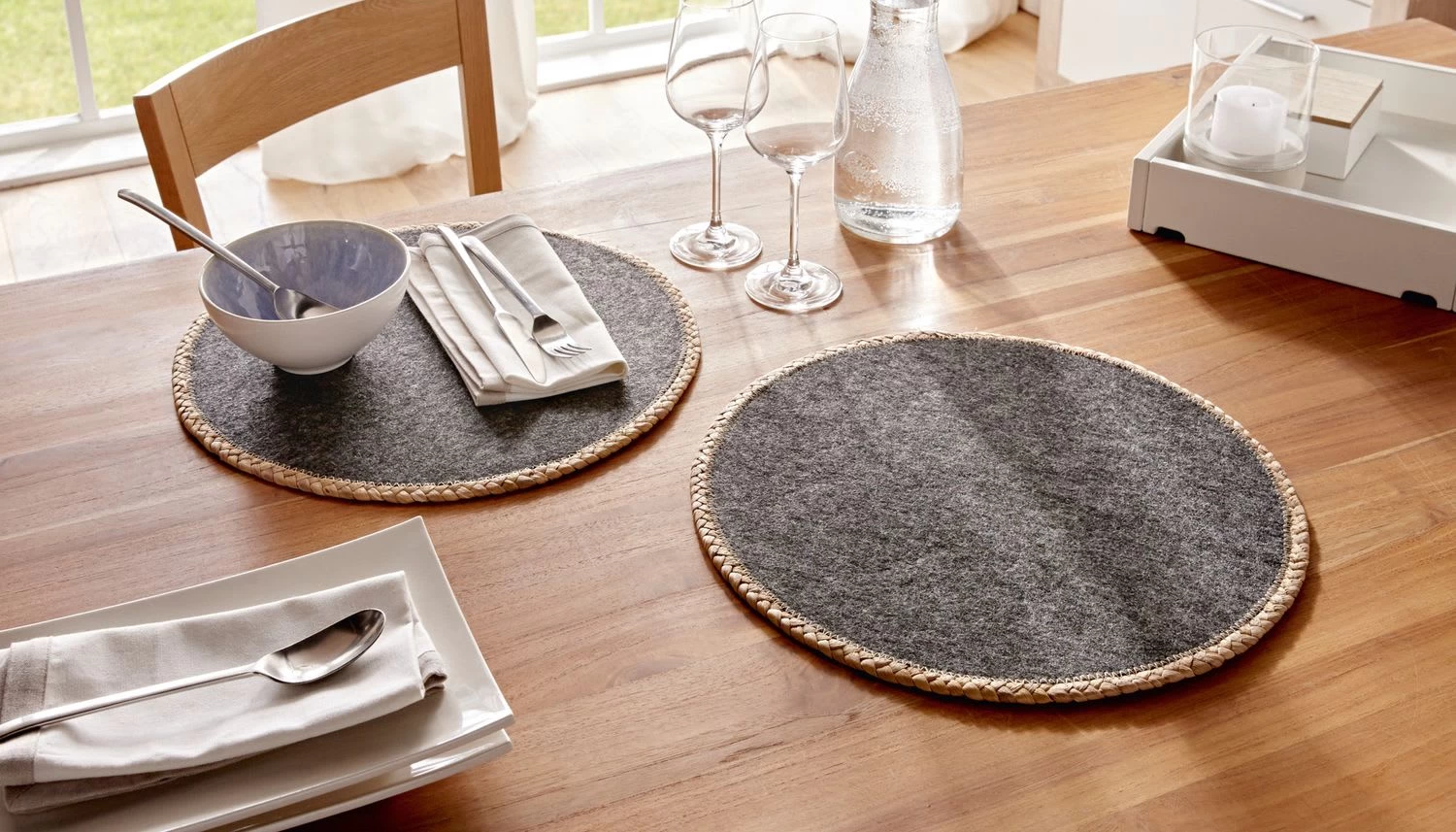 in modernem Materialmix, dunkelgraues Filz mit aufwändigem Flechtrand aus Wasserhyazinthe, beidseitig verwendbar