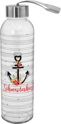 – Flasche Schwesterherz, bedruckt im Streifendesign mit einem Anker-Motiv und dem Spruch „Schwesterherz“